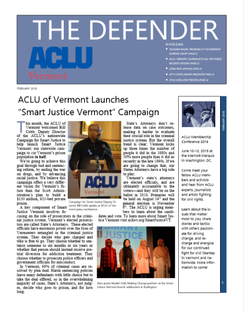 If you would like to receive a paper copy of The Defender, please email [email protected] or call (802) 223-6304 x111. Thank you for supporting the ACLU of Vermont!